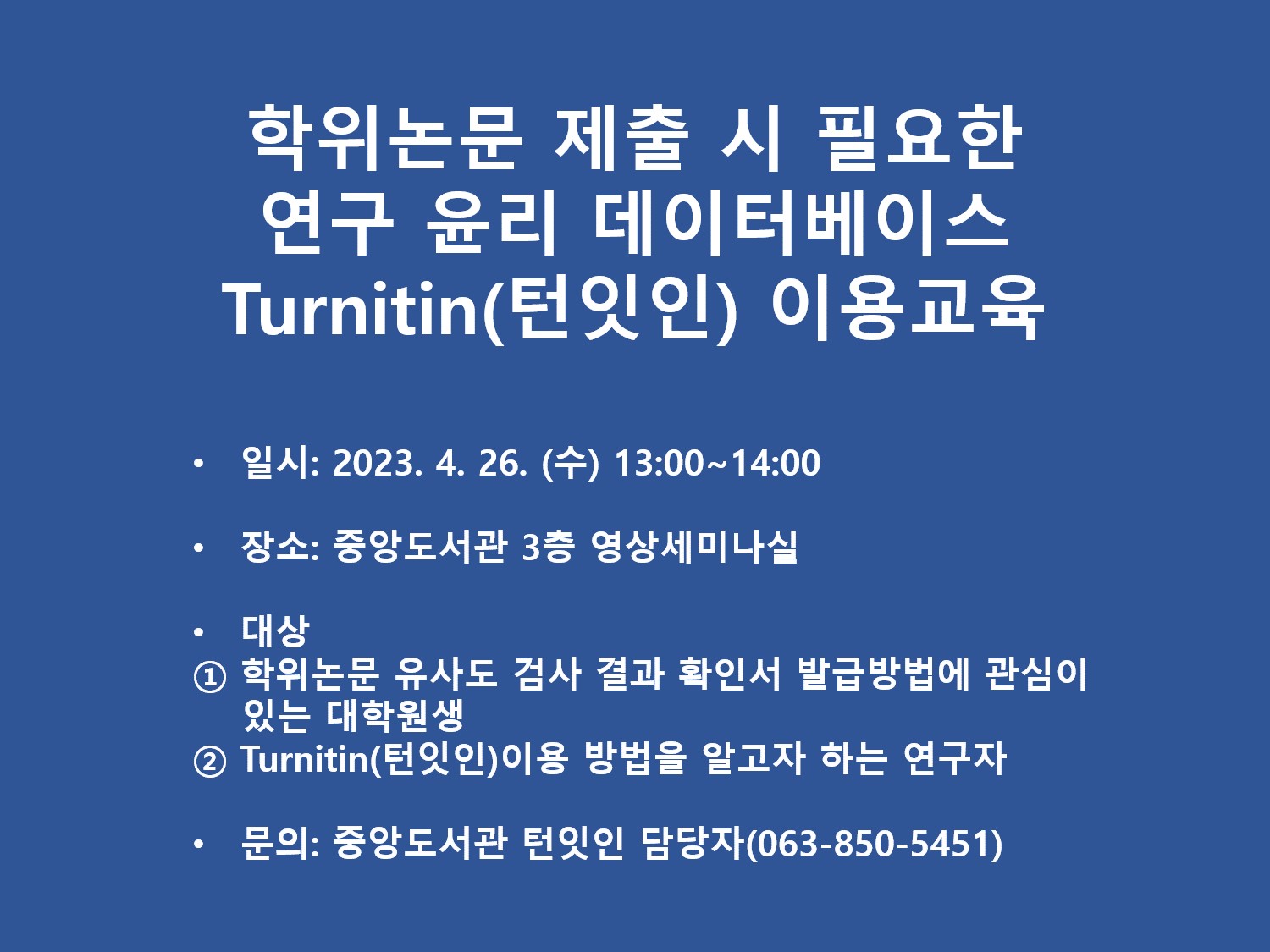 공지사항 홈게시판공지사항 대학원생 대상 Turnitin(턴잇인) 이용교육 안내 대학원생 대상 Turnitin(턴잇인) 이용교육 안내 경영대학원2023-04-12 페이스북 트위터 구글플러스 이메일 프린트 중앙도서관에서 본교 대학원생을 대상으로 Turnitin(턴잇인) 교육을 진행합니다. 본 교육은 오프라인으로 진행되며, 학위논문을 준비하는 과정에서 턴잇인을 이용하고자 하는 대학원생의 많은 관심과 참여를 바랍니다. 이전공지사항다음