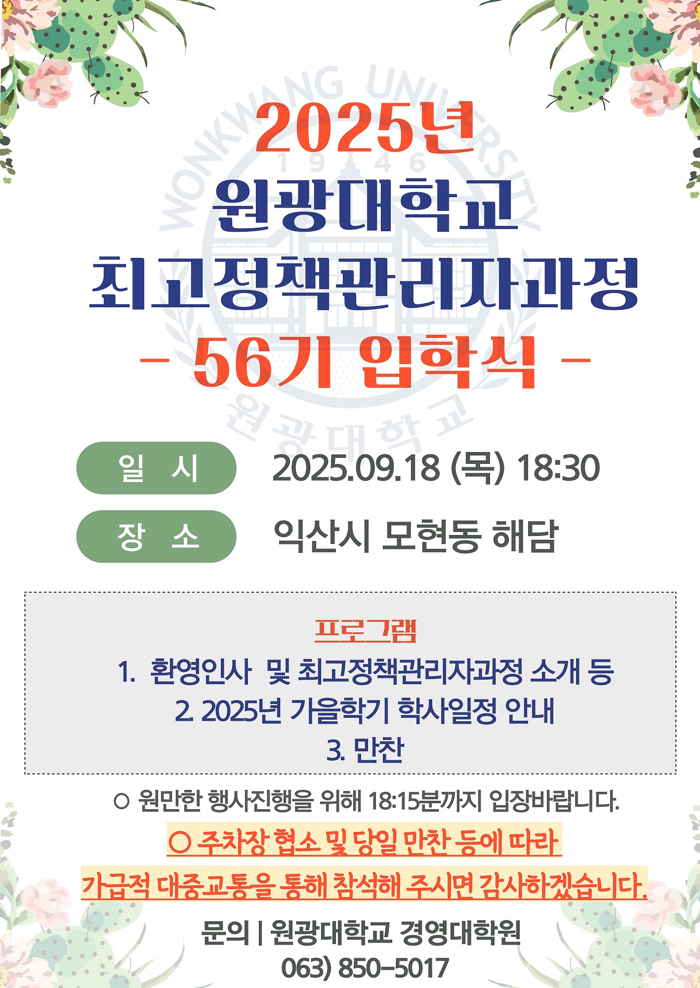 공지사항 홈최고정책관리자과정공지사항 최고정책관리자과정 제 56기 가을학기 입학식 안내 최고정책관리자과정 제 56기 가을학기 입학식 안내 경영대학원2025-09-04 페이스북 트위터 구글플러스 이메일 프린트 공지사항